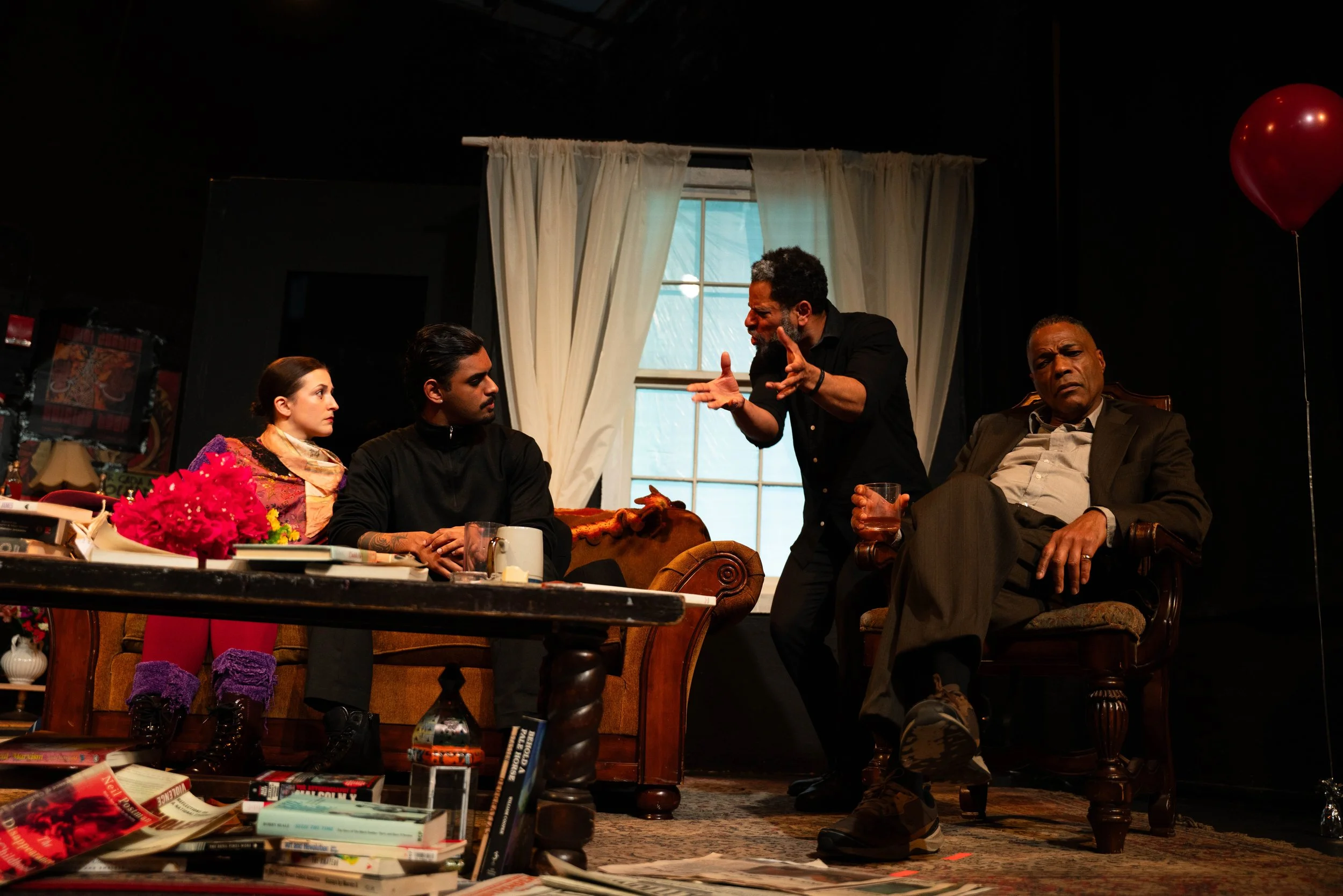 While the artist must allow for a multitude of feelings and ideas to intersect, the passions of life fuel and form the bulk of the work and concepts we engage. Theater is a place where extremes should be appreciated; where surrealism and logic converge. Where the hawks and doves put down their wings to battle it out on stage. The Kangalee Arts Ensemble is a laboratory for actors and dramatists as much as it is a state of mind. Inspired by the work of Antonin Artaud, Bertolt Brecht, the Living Theater, the Black Arts Movement, Bread & Puppet Theater and the melding of ideas from revolutionary resistance philosopher Frantz Fanon — with the Father of Psychological Realism, Constantine Stanislavsky’s, Acting “system” or “method.” Politics and art collide: Ward Nixon, Dennis Leroy Kangalee, and Justine Stock in the 2024 tragedy, The Life & Death of Art.